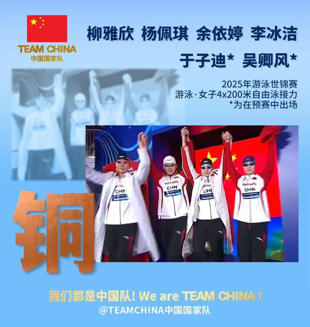 7月31日晚,柳雅欣、杨佩琪、余依婷和李冰洁组合以7分42秒99收获一枚铜牌。按照世界泳联的规定,当日上午参加了预赛的于子迪和吴卿风同样可以拿到奖牌。