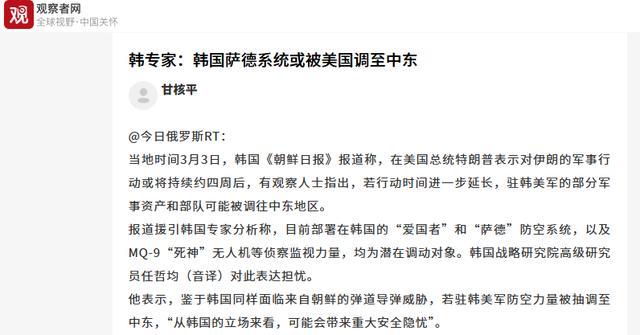 如果战事延长,美军不得不考虑从其他地方抽调兵力去驰援中东。这下子,连锁反应来了。据韩国《朝鲜日报》3月3日的报道,韩国人现在是真急了。